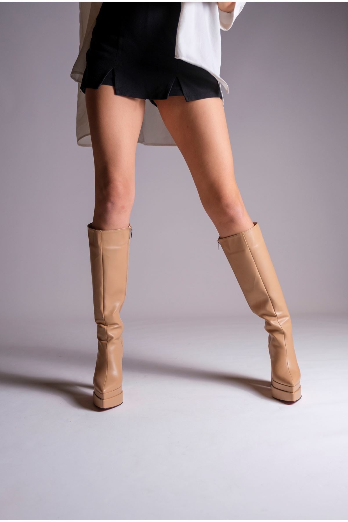 Nude Çift Platform Tasarım Kadın Çizme Yüksek Topuklu Ayakkabı Jolly